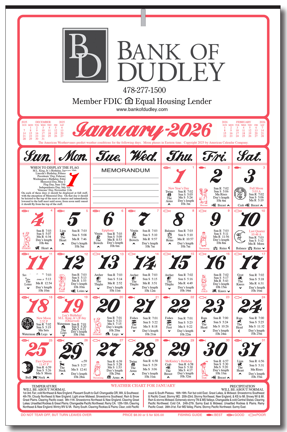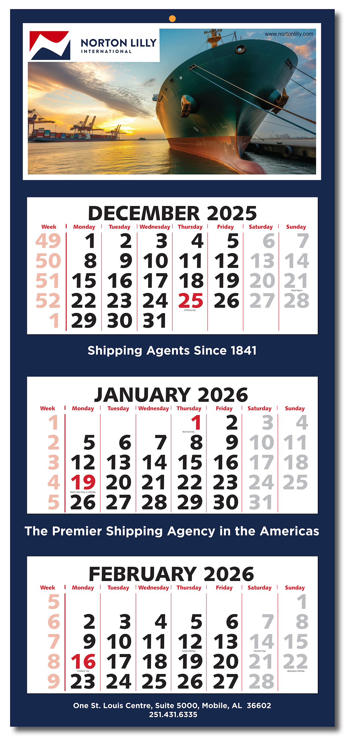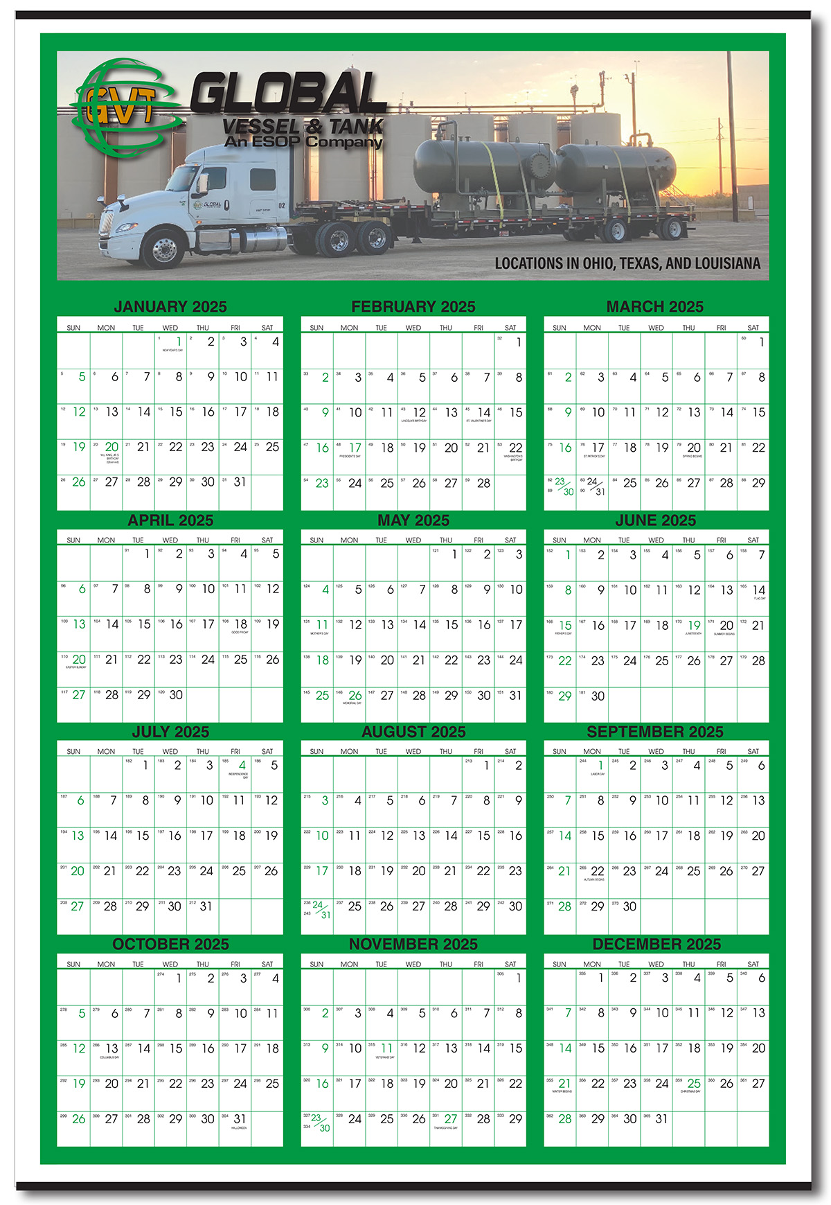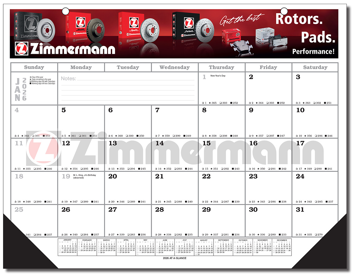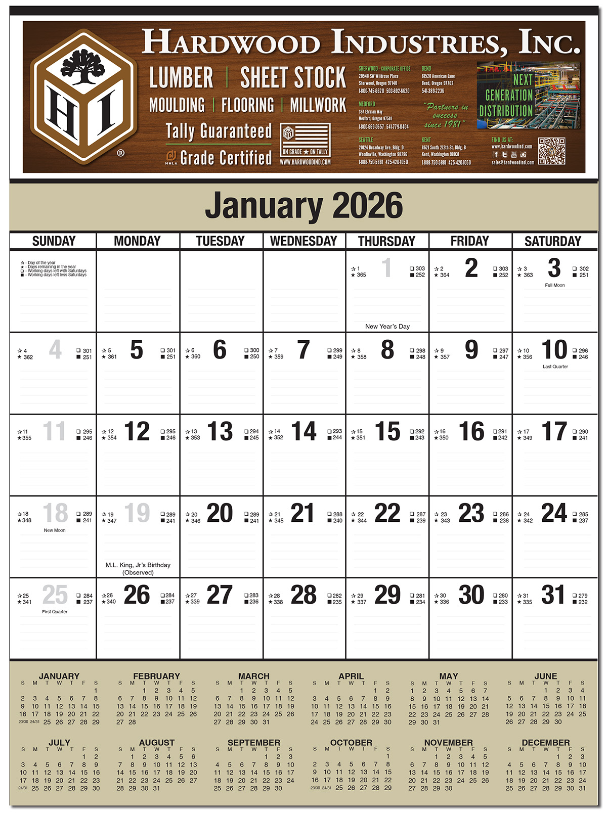 If you want to get your ad message seen every day all year long, then this poster size 22” x 34” Yearly View Wall Calendar will get the job done! Printed on heavy 100# opaque stock in standard colors of PMS186 red and black, tinned at the top and bottom with a plastic eyelet for hanging. Borders can be in any color you choose with a small set-up charge, see Standard PMS Colors in options for charges. Prices include your 19”w x 5.75”h imprint in black at the top. Weekly numbering can be added at no charge, order style number W101. See options for other imprint colors, wrappers, lamination, etc. Preproduction digital proof included.